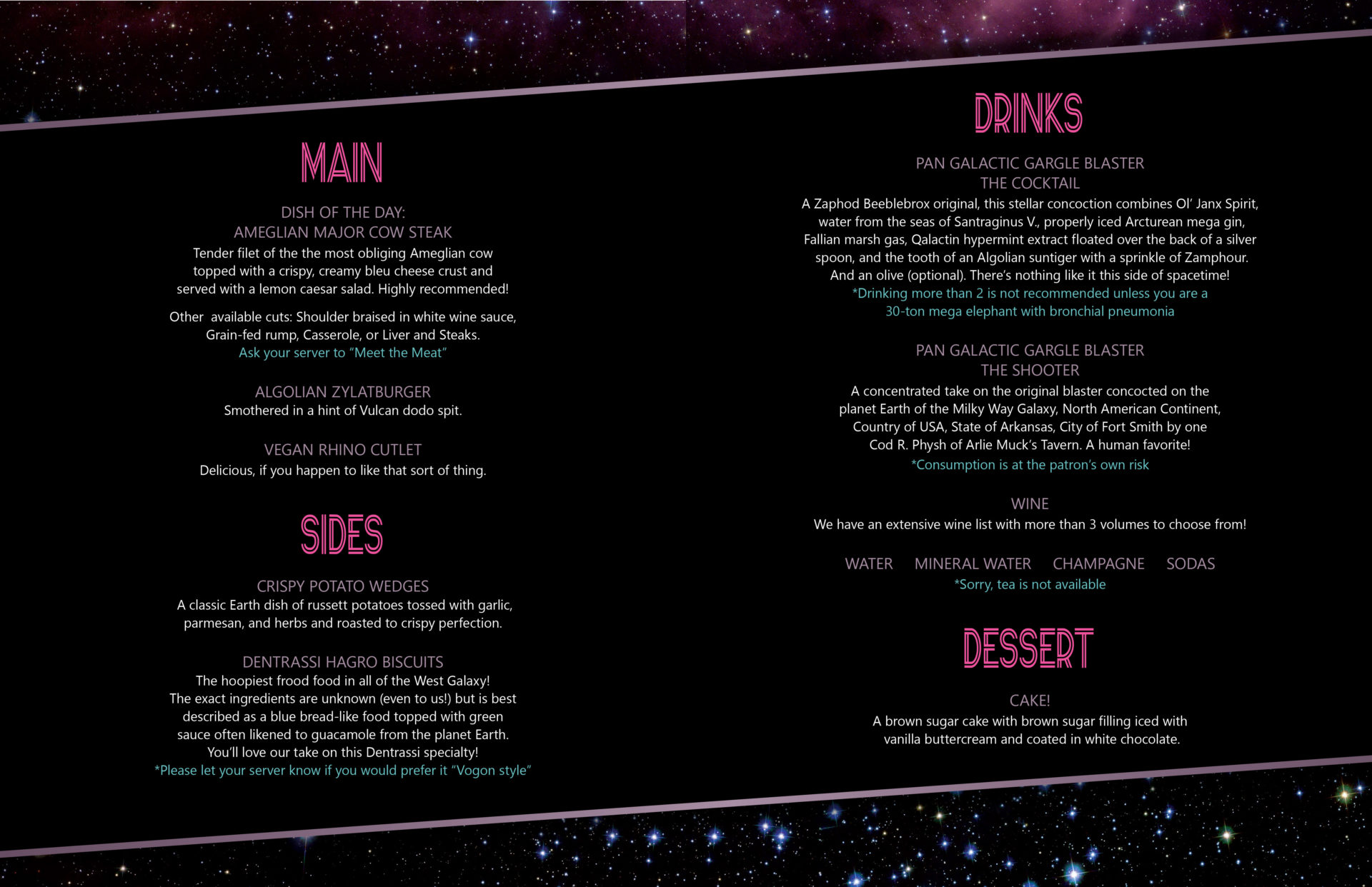 Graphic design created using menu items describer in The Restaurant at the End of the Universe by Douglas Adams.