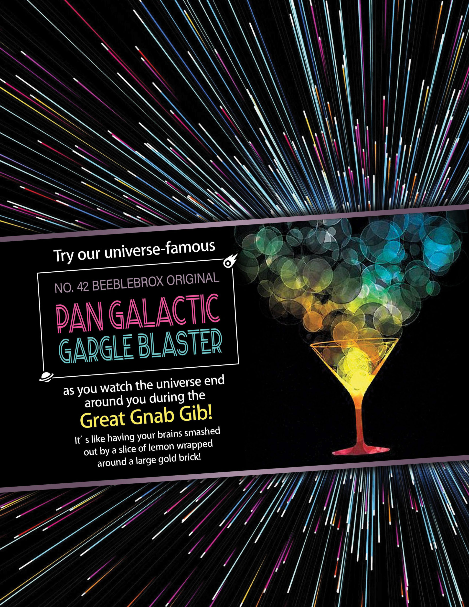 Graphics were created using references to the Milliways ad as seen in the 1981 Hitchhiker’s Guide television series as well as a version of one of the covers for The Restaurant at the End of the Universe
