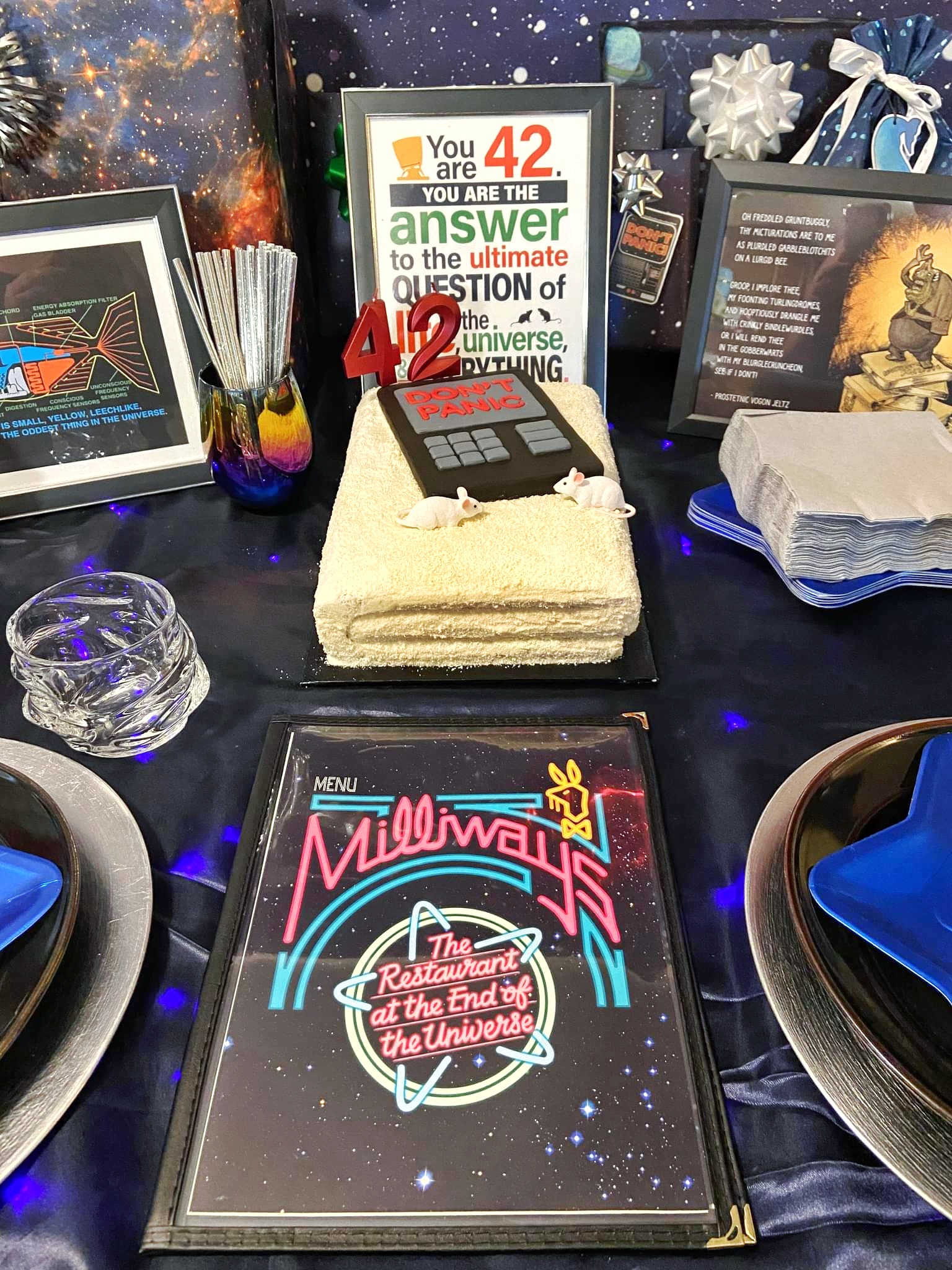Table setting for a Hitchhiker’s Guide themed 42nd birthday